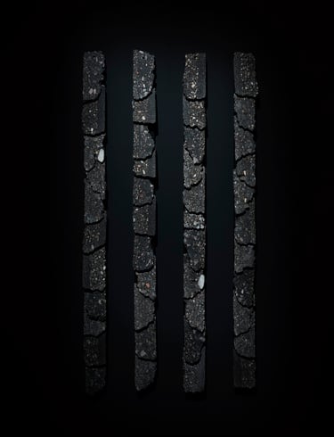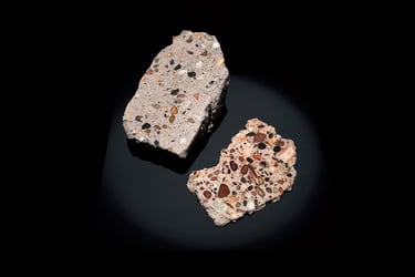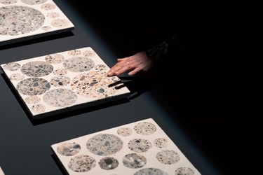 Dabei wurden durch Querschnitte durch das Material die schon vorhandenen Qualitäten, wie die zylindrische Form von Bohrkernen oder die Terrazzo-Optik im Inneren von Betonbrocken zum Vorschein gebracht, betont und in einen nutzbaren Kontext gesetzt. Die entstandenen Materialscheiben können durch verschiedene Verbindungstechniken als architektonische Halbzeuge genutzt und in Wandpaneele, Fliesen oder Fassadenelemente eingebracht werden.